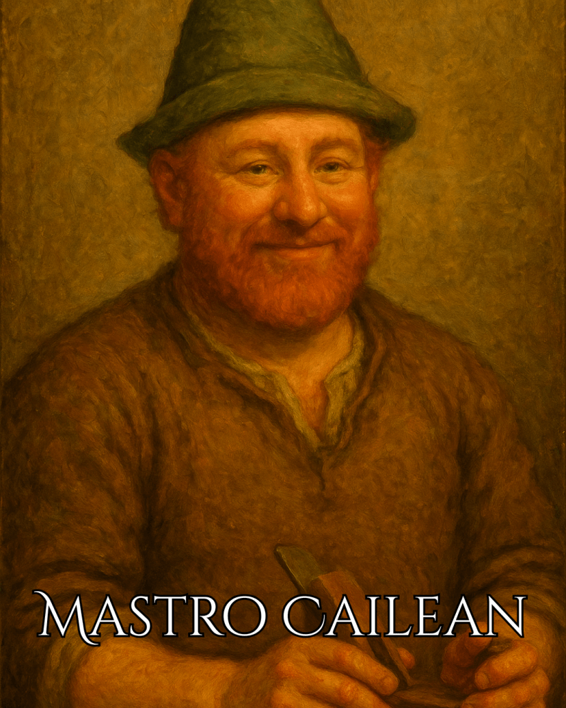Abile capomastro, proprietario di una segheria nel villaggio irlandese di Farran. Fornisce legname via fiume alla Compagnia del Naso-lungo. Vuoi trascorrere una serata in taverna in compagnia di un allegro irlandese ricoperto di trucioli? Mastro Cailean è l’uomo che fa per te! Badate però di non fare le ore piccole, perché sua moglie Evleen, che gestisce la bottega, è sempre pronta a sgridarlo per le sue continue sbronze…